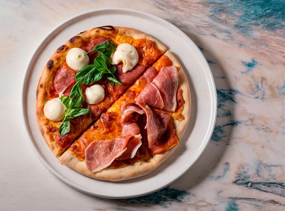 Treat yourself to a pizza masterpiece! One side features creamy mozzarella and prosciutto, while the other boasts crimini mushroom and...